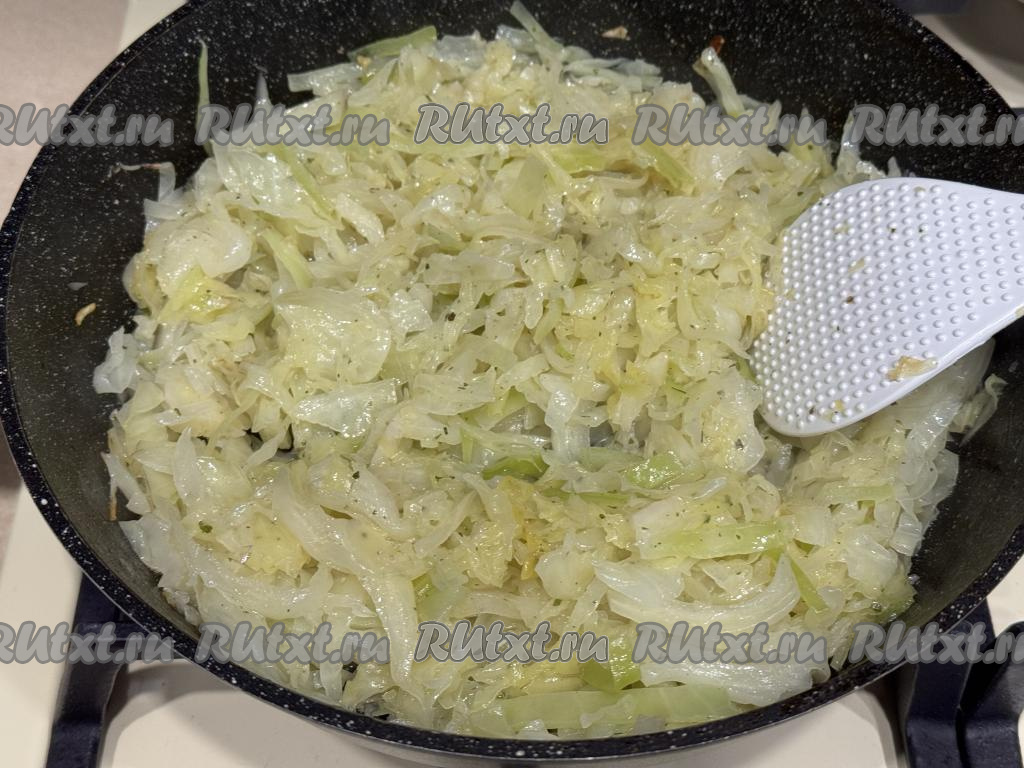 Прогреть растительное масло в сковороде, выложить нарезанную капусту. Обжарить капусту в течение 15-20 минут (она должна стать достаточно мягкой) на среднем огне, периодически перемешивая. В процессе обжаривания посолить и приправить специями. Убрать капусту с огня, дать немного остыть.