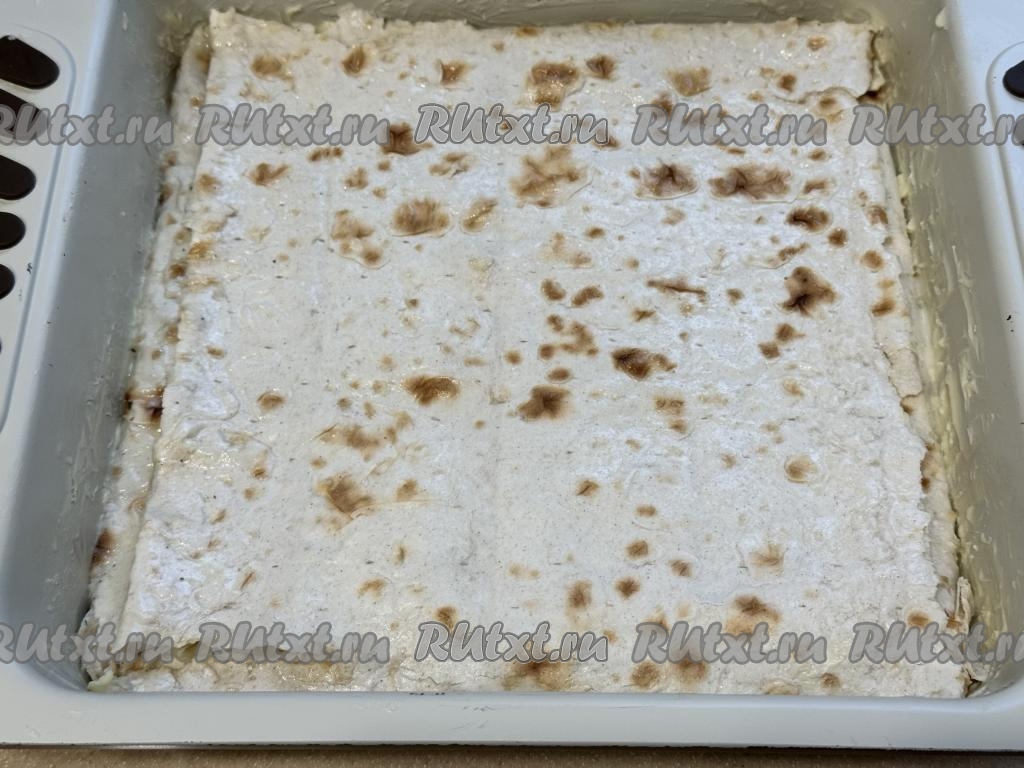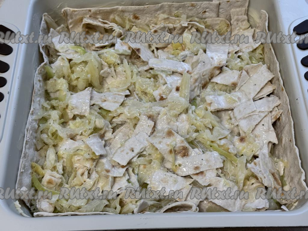 Выложить начинку из лаваша и капусты в форму, застеленную лавашами, равномерно распределить.
