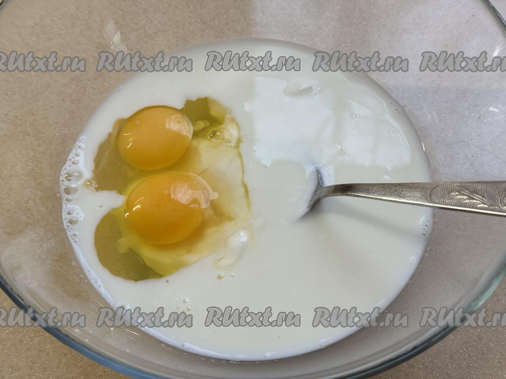 В глубокой миске соединить молоко, яйца и сметану, посолить по вкусу, перемешать яично-молочную смесь вилкой до однородности.