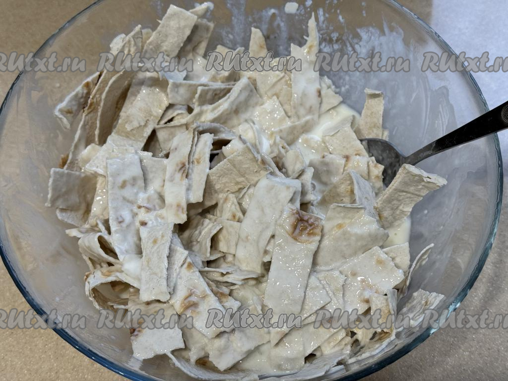 Остальной лаваш нарезать на полоски шириной примерно 1,5 сантиметра. Выложить нарезанный лаваш в миску с яично-молочной смесью.