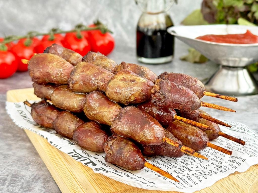 Предлагаю приготовить в аэрогриле вкусные, нежные куриные сердечки на шпажках. В результате получаются очень аппетитные мини-шашлыки. Маринад для сердечек я сделала из соевого соуса и чеснока с добавлением растительного масла. Сочные, мягкие, ароматные куриные сердечки, запечённые на шпажках, к столу можно подать с любимым соусом или с гарниром на ваш выбор.