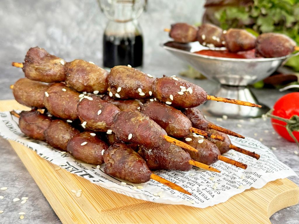 Готовые мягкие, сочные, нежные шашлычки из куриных сердечек достать из аэрогриля и подать прямо на шпажках, дополнив любимым соусом. При подаче можно посыпать блюдо кунжутом.