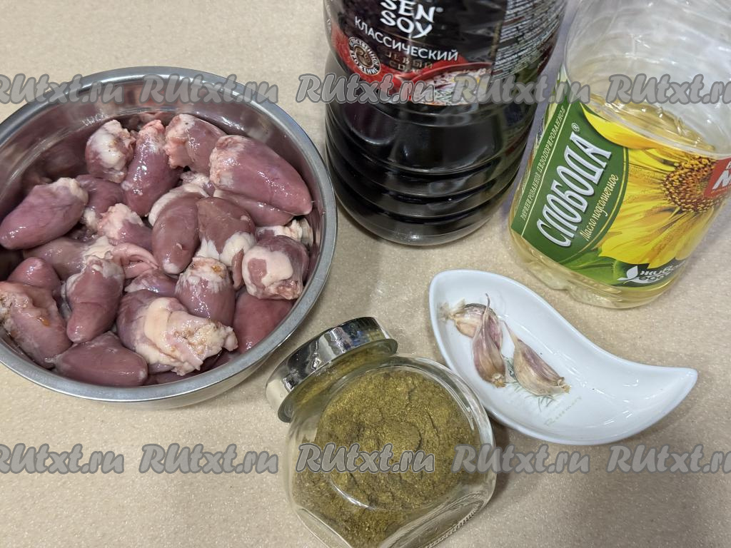 Подготовить продукты. Куриные сердечки хорошо промыть водой, отрезать крупные сосуды. Чеснок почистить.
