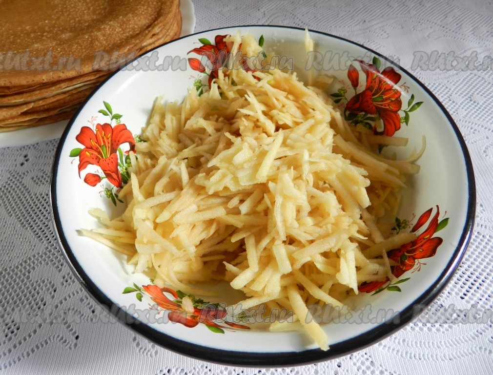 Яблоки для начинки вымыть, очистить от кожуры и натереть на крупной тёрке, не затрагивая семенную коробку с косточками, в глубокую миску. К натёртым яблокам добавить сахар, перемешать.