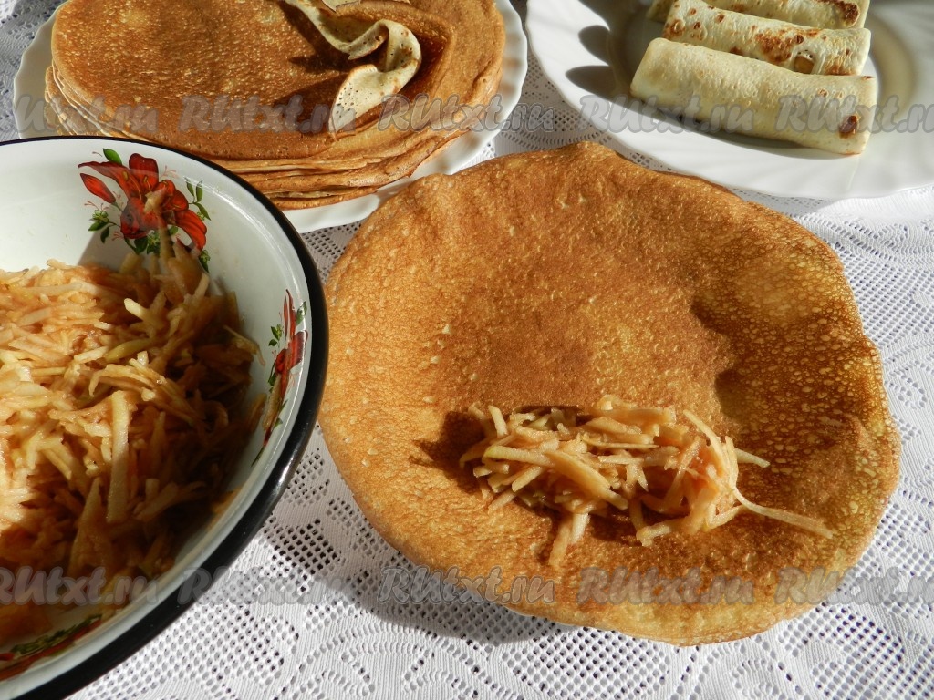 Предлагаю приготовить наивкуснейшие блины, фаршированные яблоками. Тонкие блины, приготовленные на молоке, чудесно сочетаются с нежной, сочной начинкой из свежих яблок. У этого аппетитного блюда только один минус - съев один блинчик, хочется съесть ещё и ещё.