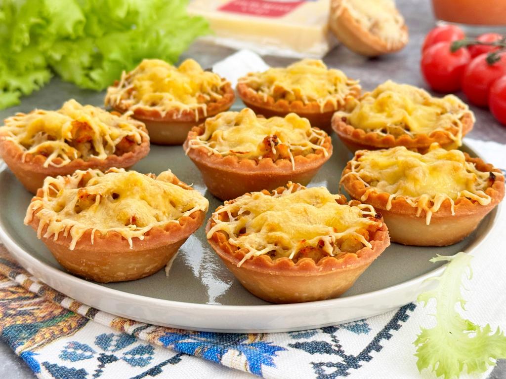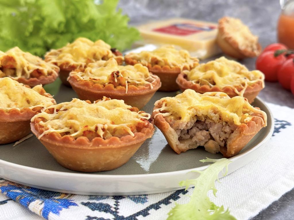 Аппетитные, вкусные тарталетки с нежной начинкой из фарша и сыра достать из духовки и в горячем виде подать к столу.