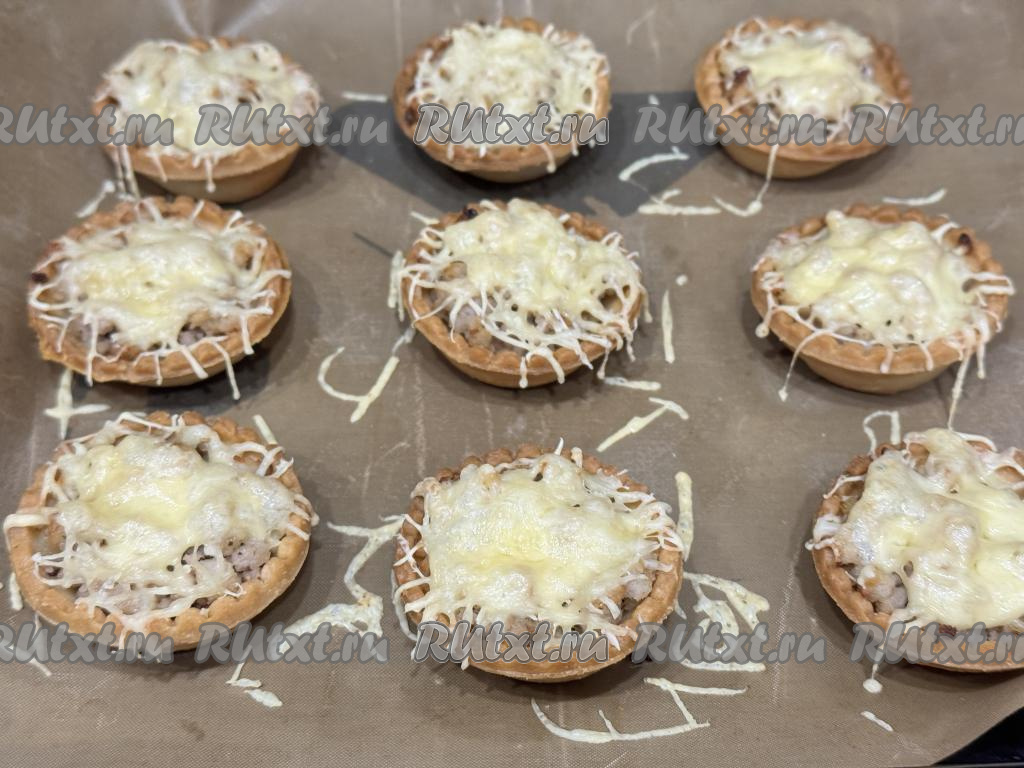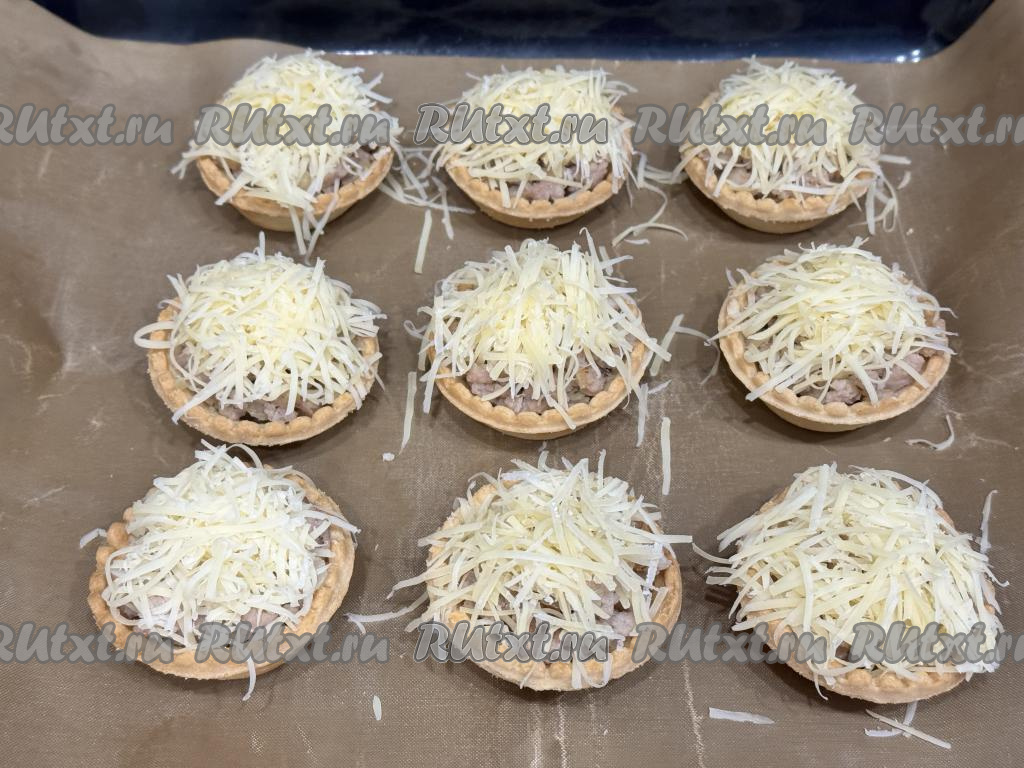 Поставить противень с тарталетками с фаршем и сыром в разогретую до 200 градусов духовку, запекать 10 минут.