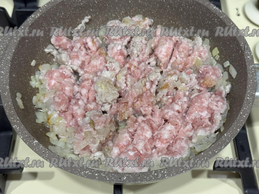 В сковороду с луком, обжаренным до прозрачности, выложить фарш, перемешать.