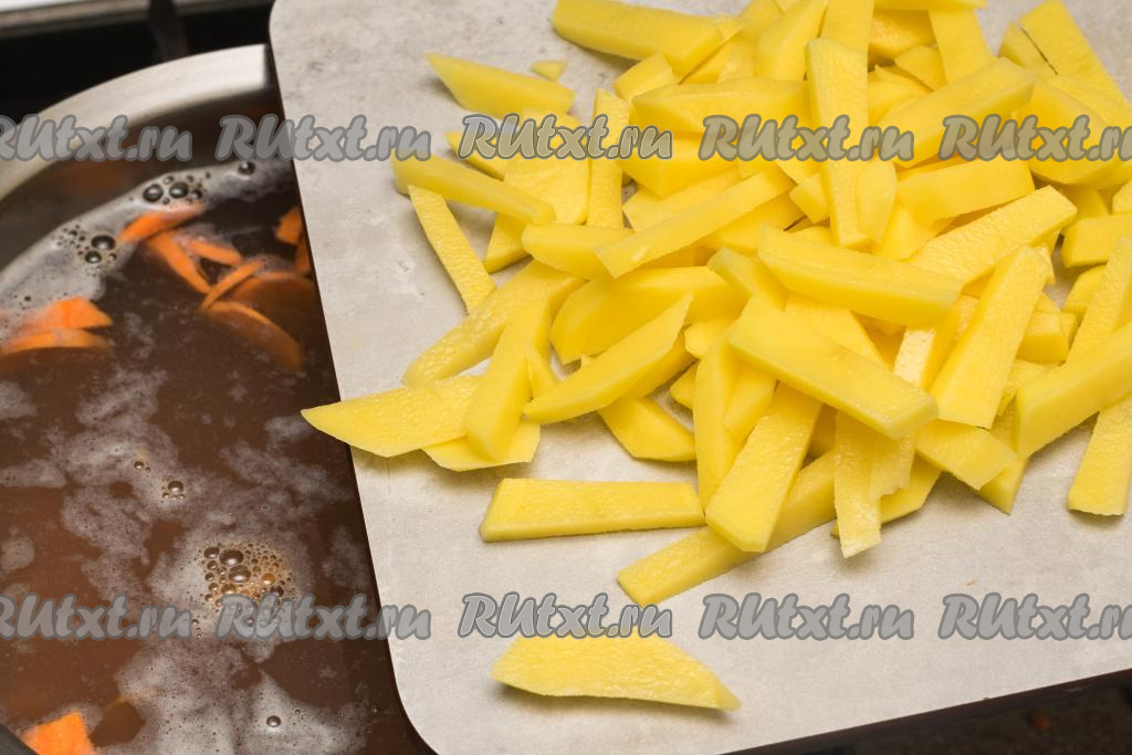 Сразу же выложить в кастрюлю очищенную картошку, нарезанную на средние брусочки.