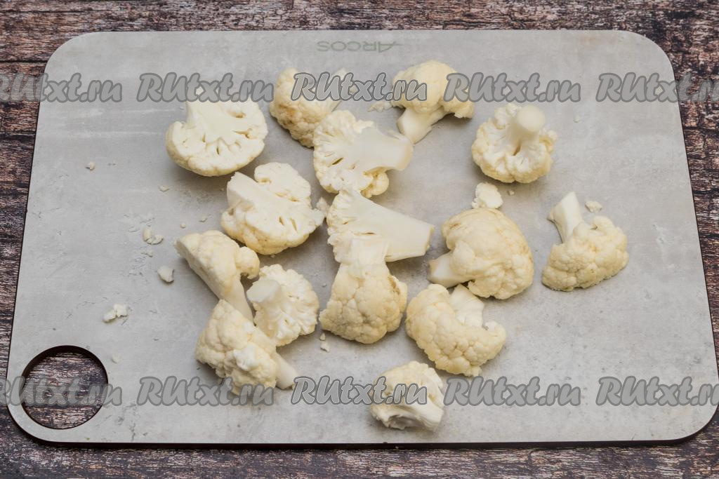 Цветную капусту вымыть, срезая, если есть, чёрные точки с поверхности кочана. Разобрать на соцветия, если соцветия крупные, их можно разрезать на 2-3 части (мелко нарезать не нужно).