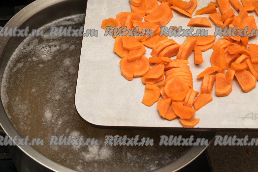 В процессе варки чечевицы до готовности количество бульона в кастрюле значительно уменьшается, поэтому нужно добавить в кастрюлю 500-800 миллилитров воды. Дать бульону закипеть, добавить в кастрюлю очищенную морковку, нарезанную на тонкие полукружочки.