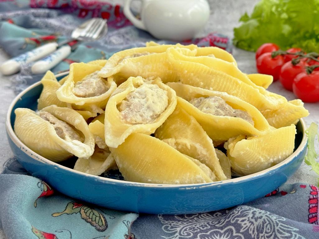 Крупные макароны "Ракушки" отлично подходят для того, чтобы наполнять их мясной начинкой, а затем тушить в различных соусах. В этот раз предлагаю приготовить макароны "Ракушки" с фаршем в сливочном соусе на сковороде. Блюдо получается очень вкусным, сытным, а готовится совершенно просто и быстро.