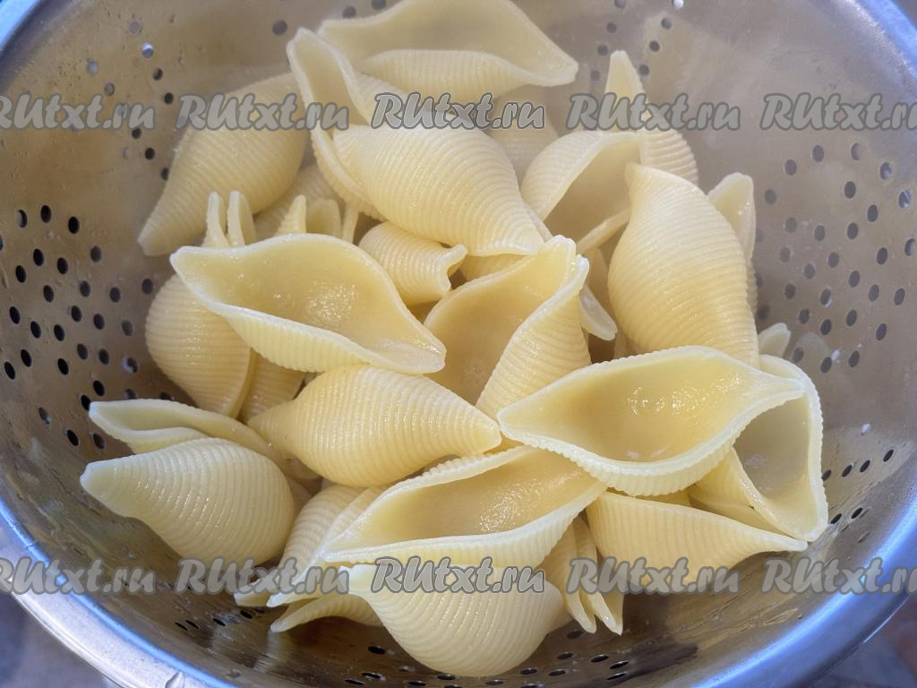Затем откинуть макароны на дуршлаг, дать воде стечь. Оставить макароны в дуршлаге на несколько минут, чтобы ракушки остыли.