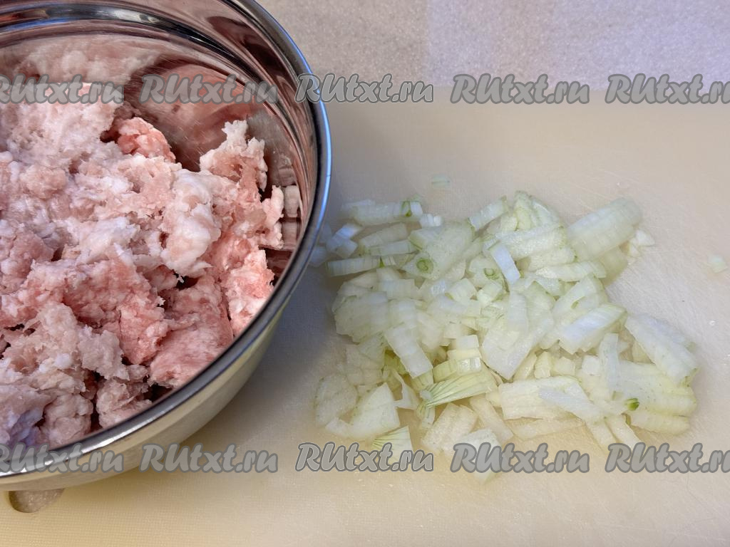 Мясной фарш выложить в глубокую миску. Лук очистить и мелко нарезать (или пропустить через мясорубку).
