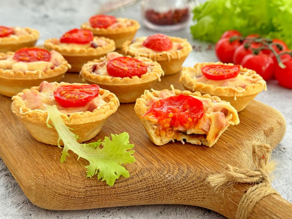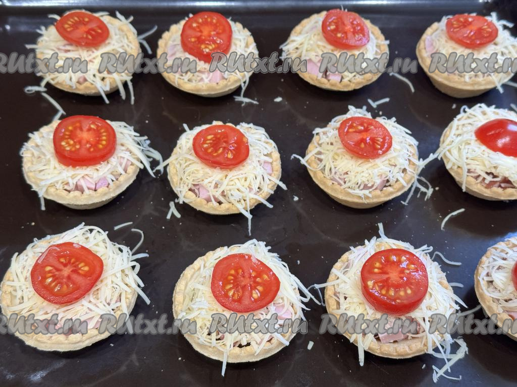 Аппетитные тарталетки с мини-пиццами достать из духовки и в горячем виде подать к столу.