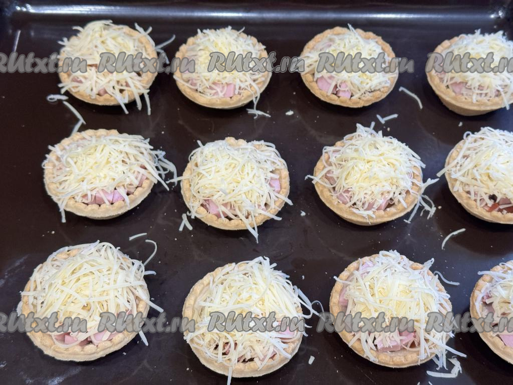 Поставить противень с тарталетками с мини-пиццами в разогретую до 180 градусов духовку, запекать 10-15 минут (до полного расплавления сыра).