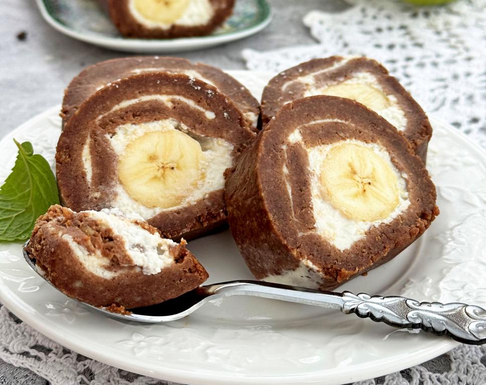 Аппетитные кусочки рулета, приготовленного из печенья и банана без выпечки, выложить на тарелку и подать вкусный, нежный десерт к столу.