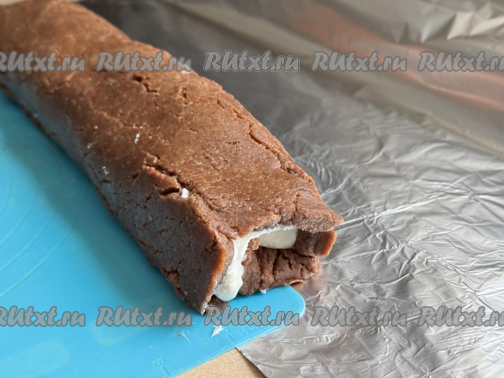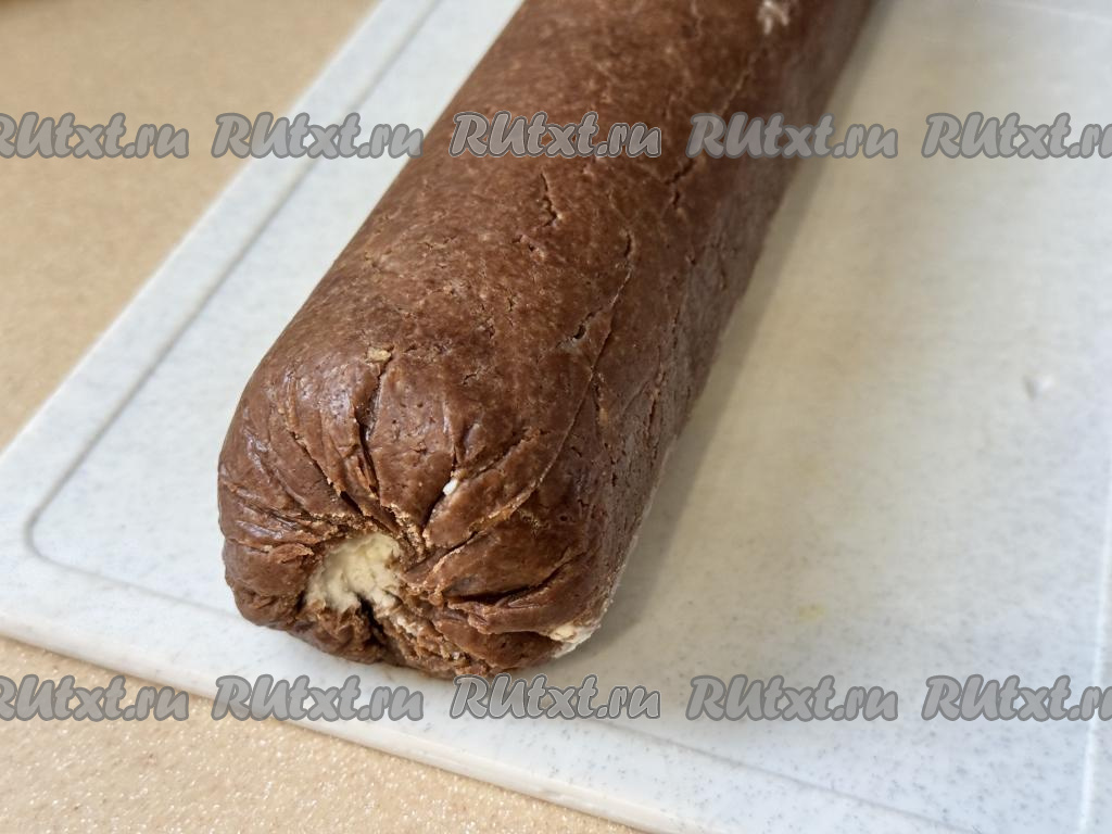 При помощи силиконового коврика (или пищевой плёнки) свернуть пласт с творожной начинкой и бананом в рулет, начиная сворачивать с более широкой стороны пласта. Переложить рулет на лист фольги. Плотно завернуть рулет из печенья и банана в фольгу, как конфету, и отправить в холодильник для стабилизации на ночь.
