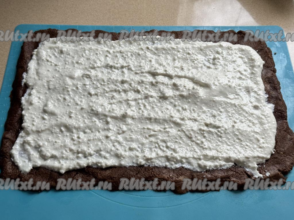Творожную начинку выложить на пласт, отступая от краёв пласта по 1 сантиметру.