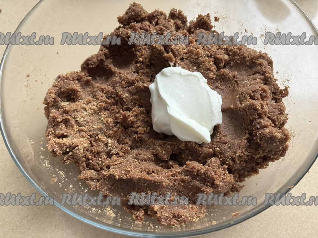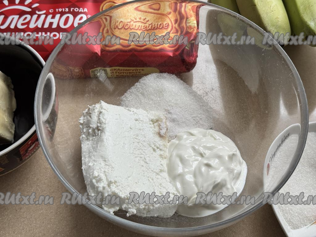 В миску с получившейся песочно-банановой массой добавить сметану.