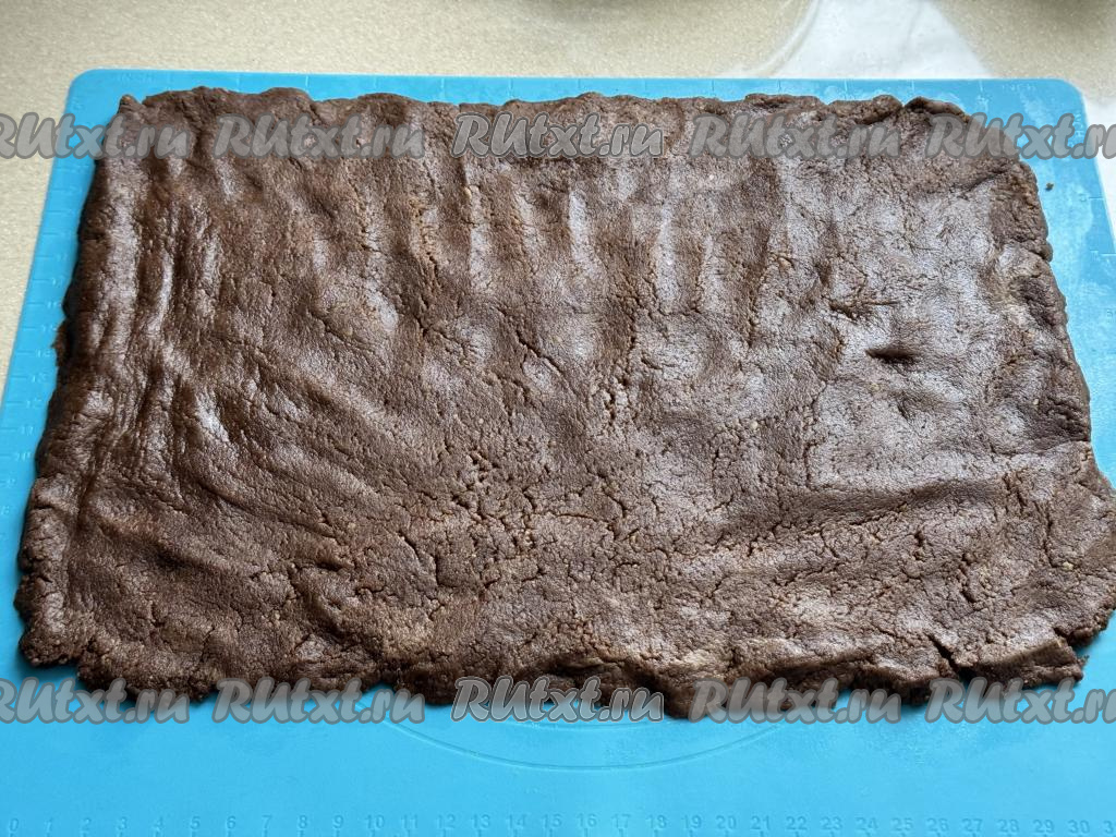 Выложить массу на силиконовый коврик (или на пищевую плёнку, сложенную в два слоя) и равномерно распределить, формируя пласт толщиной примерно 1 сантиметр.