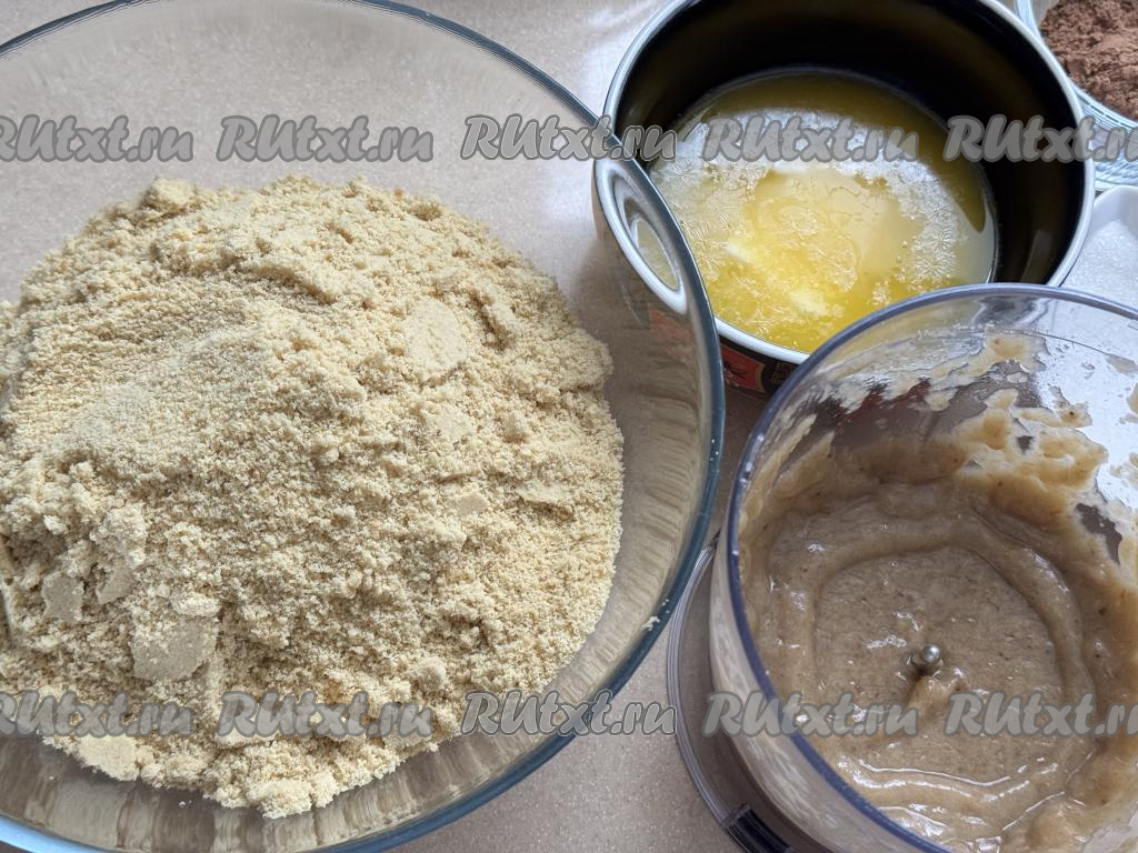 Теперь займёмся основой для рулета. Для этого печенье нужно превратить с помощью измельчителя в крошку, пересыпать в миску. 160 грамм очищенного банана превратить в пюре в измельчителе. Сливочное масло растопить, дать ему немного остыть.