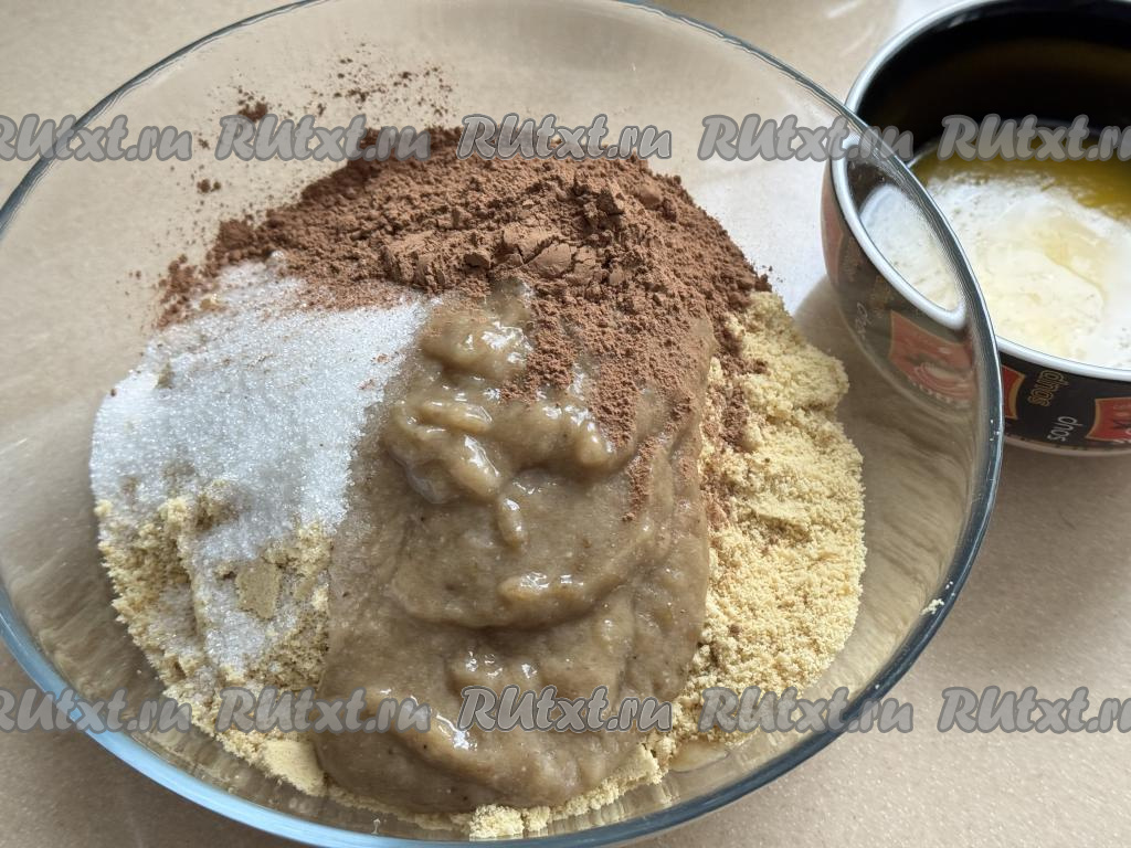 В миску с крошкой из печенья добавить банан, измельчённый в пюре, всыпать какао и сахар.