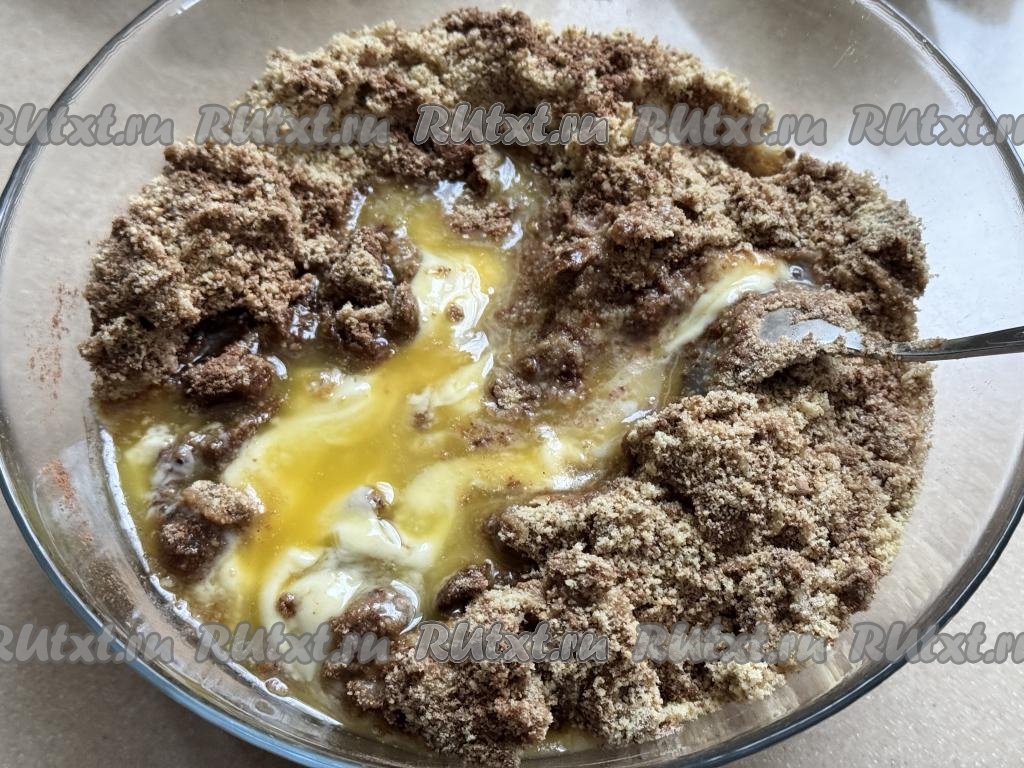 Перемешать массу столовой ложкой до однородности, добавить растопленное негорячее масло, снова перемешать.