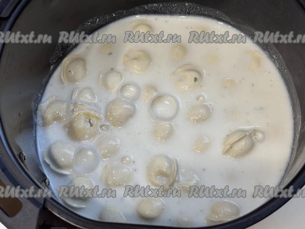 Влить получившийся сметанный соус в чашу аэрогриля к пельменям. Соус должен практически полностью покрывать пельмени, если необходимо, добавьте ещё немного кипящей воды. Чашу с пельменями в сметане отправить в аэрогриль. Выставить температуру 200 градусов, время - 20 минут.