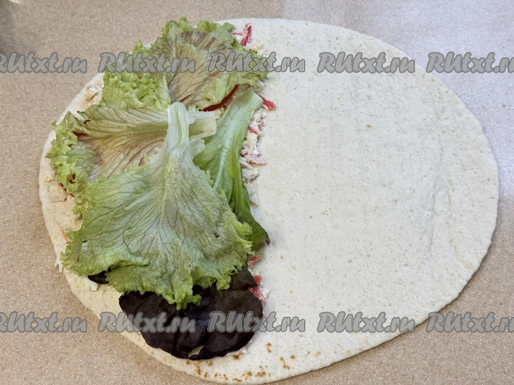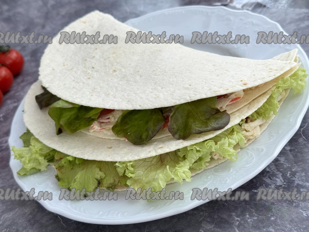 Таким же образом сформировать ещё 3 тортильи с начинкой из крабовых палочек, яиц, помидоров и листьев салата.
