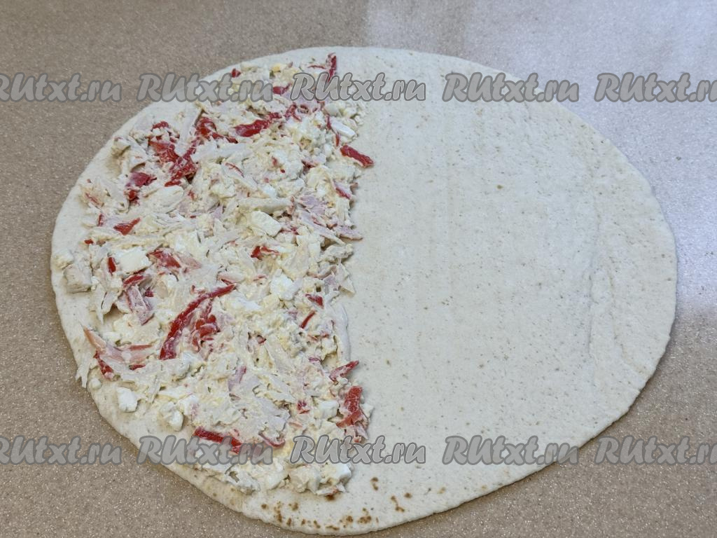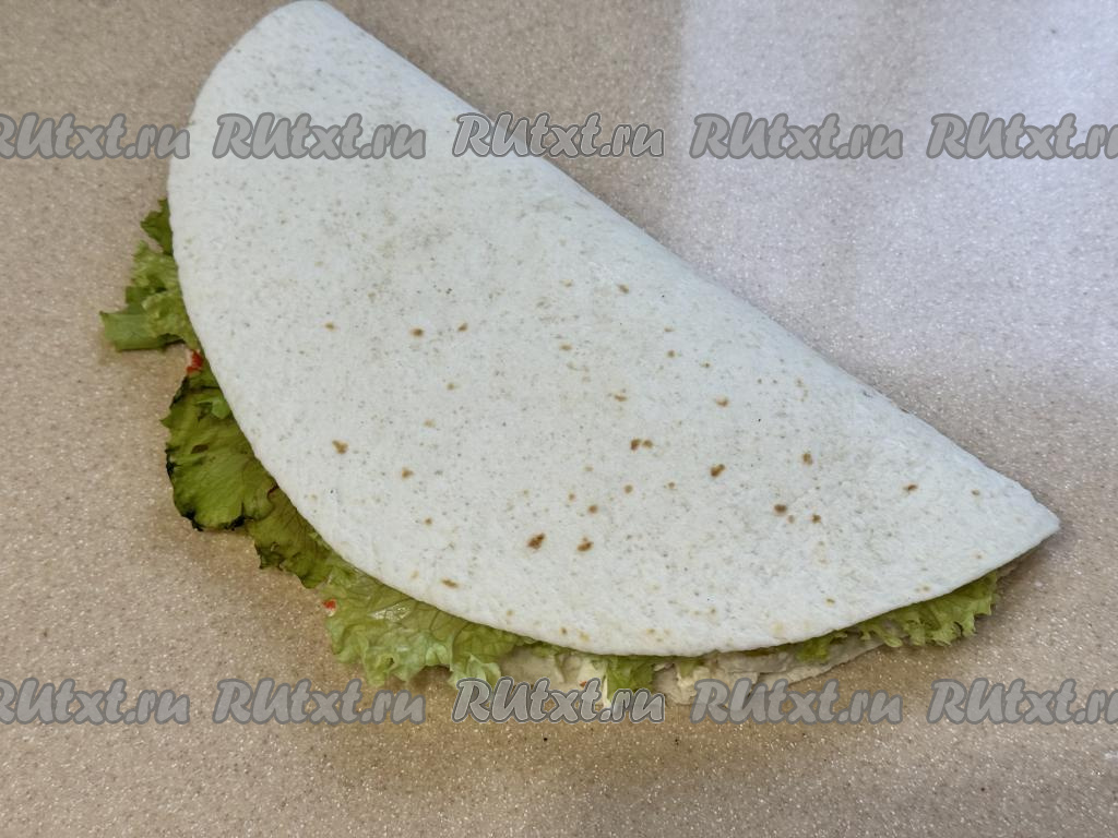 Половину тортильи с начинкой накрыть чистой половиной тортильи.