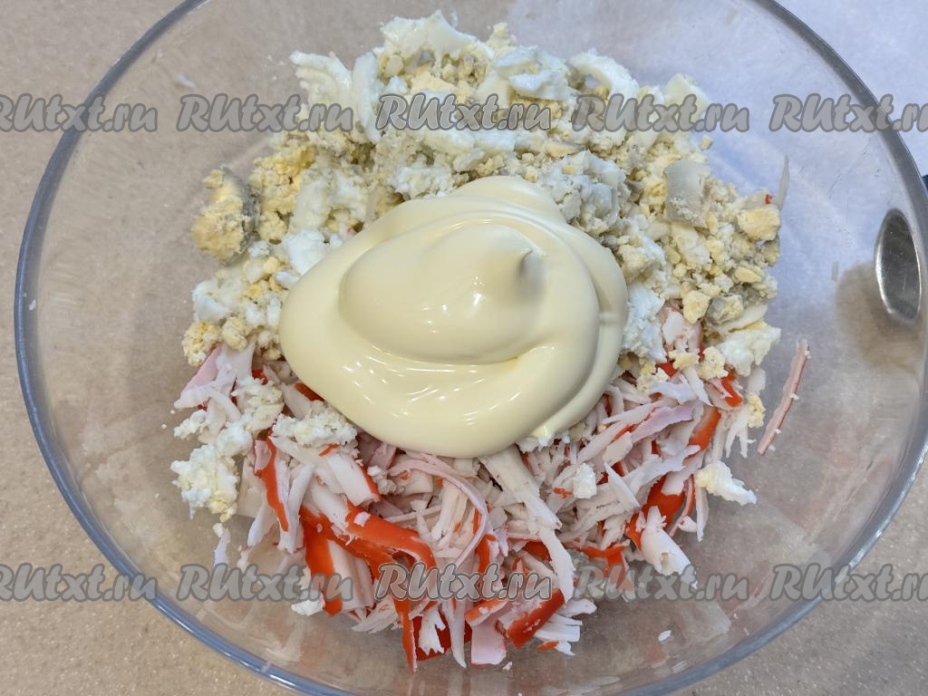 Соединить в миске крабовые палочки, яйца и майонез.