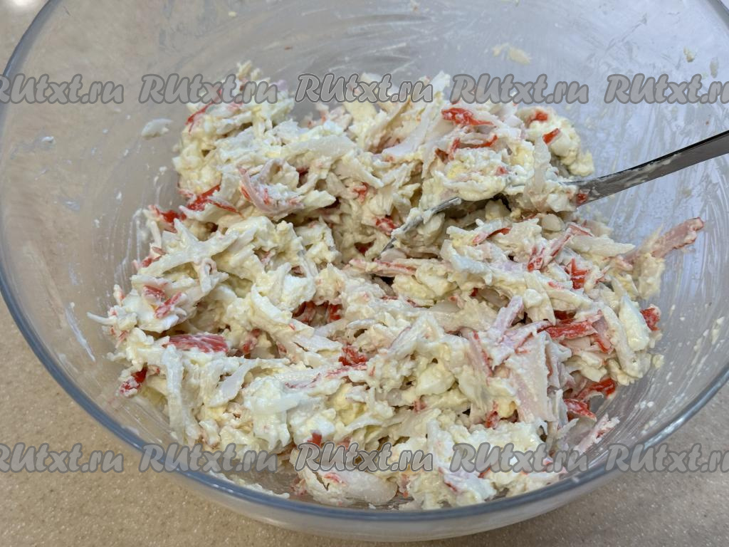Перемешать и начинка из крабовых палочек и яиц готова.