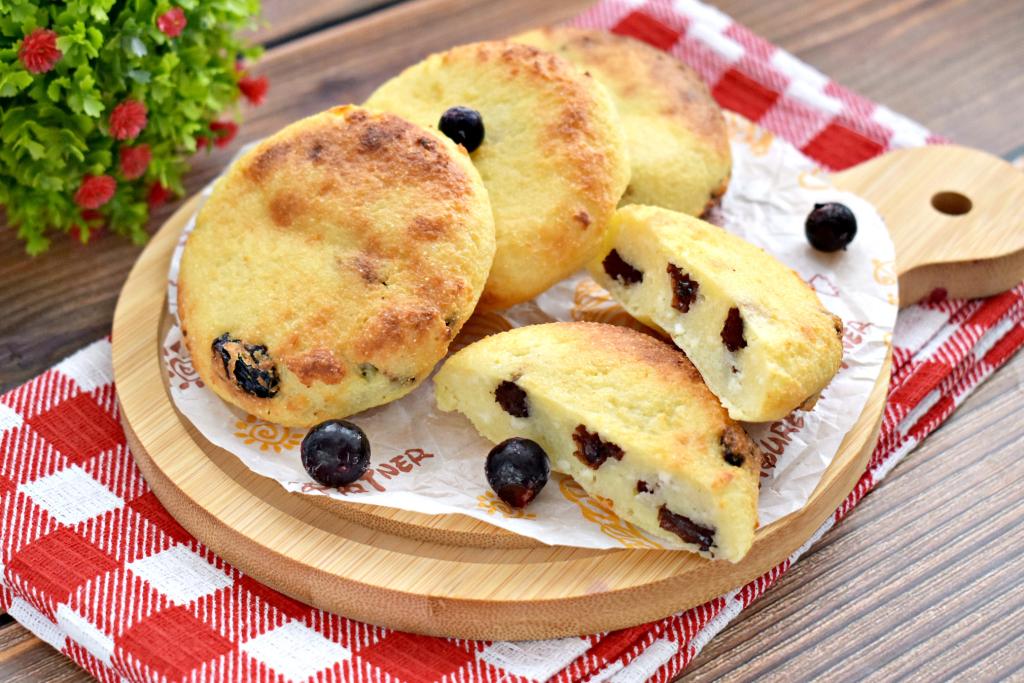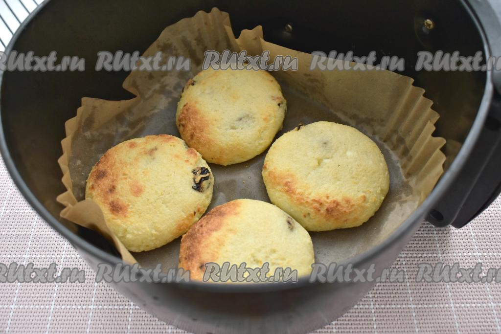 Аппетитные, нежные, мягкие сырники с изюмом достаём из чаши аэрогриля, выкладываем на тарелку и в горячем виде подаём к столу.