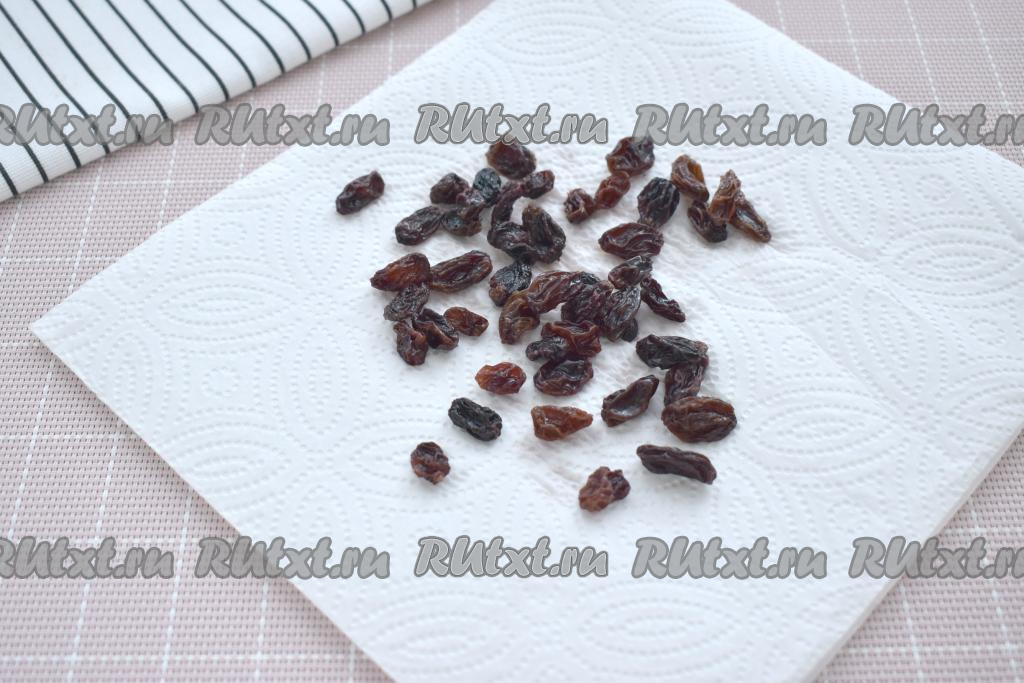 Изюм перебираем, удаляя, если есть, остатки веточек. Перекладываем изюм в небольшую миску, заливаем кипящей водой, оставляем минут на 5. Затем откидываем изюм на сито. Промываем изюм проточной водой, даём стечь лишней воде. Раскладываем изюм на бумажных полотенцах и оставляем его на несколько минут обсохнуть.