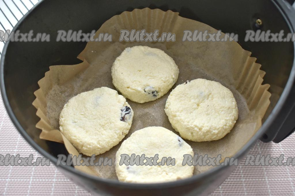 Через 15 минут зрительно делим тесто на 4 равных части (то есть в дальнейшем мы будем формировать 4 сырника). Слегка смачивая руки водой, формируем 4 круглых сырника. Чашу аэрогриля застилаем пергаментом, немного смазываем растительным маслом, чтобы сырники точно не пригорели. В застеленную чашу выкладываем сформированные сырники с изюмом. Сразу отправляем чашу в аэрогриль. Включаем аэрогриль на температуру 180 градусов, время устанавливаем - 25 минут.