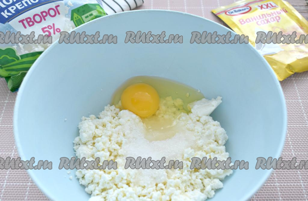 Для приготовления сырников можно взять творог любой жирности и консистенции (я купила творог жирностью 5%). В достаточно глубокую миску выкладываем творог, всыпаем соль, ванильный сахар и обычный сахар, вбиваем яйцо, растираем творожную массу вилкой до однородности.
