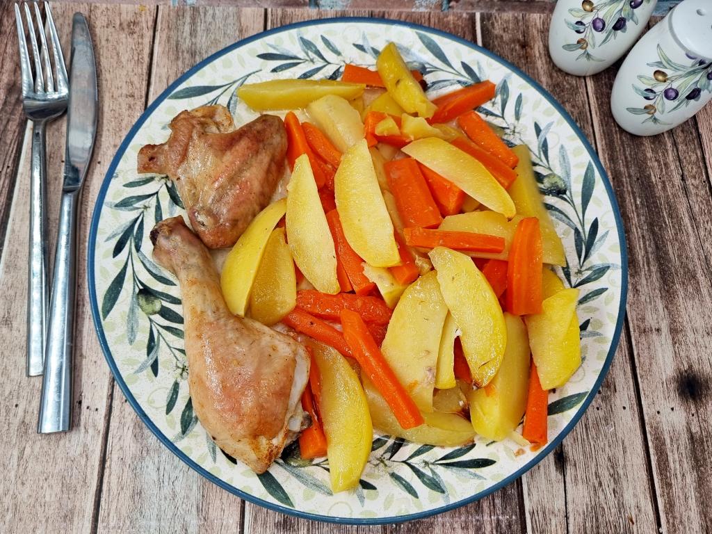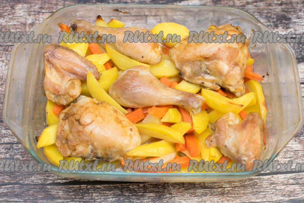 Форму с готовым блюдом достать из духовки. Сочные кусочки курицы вместе с аппетитными, нежными картошкой и морковкой разложить по тарелкам и в горячем виде подать вкусное, насыщенное блюдо к столу.