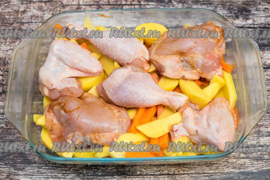 Духовку разогреть до 200 градусов, затем отправить в неё форму с картошкой, морковкой и курицей. Запекать примерно 60-70 минут.