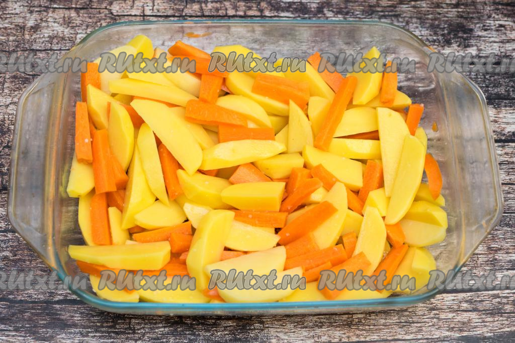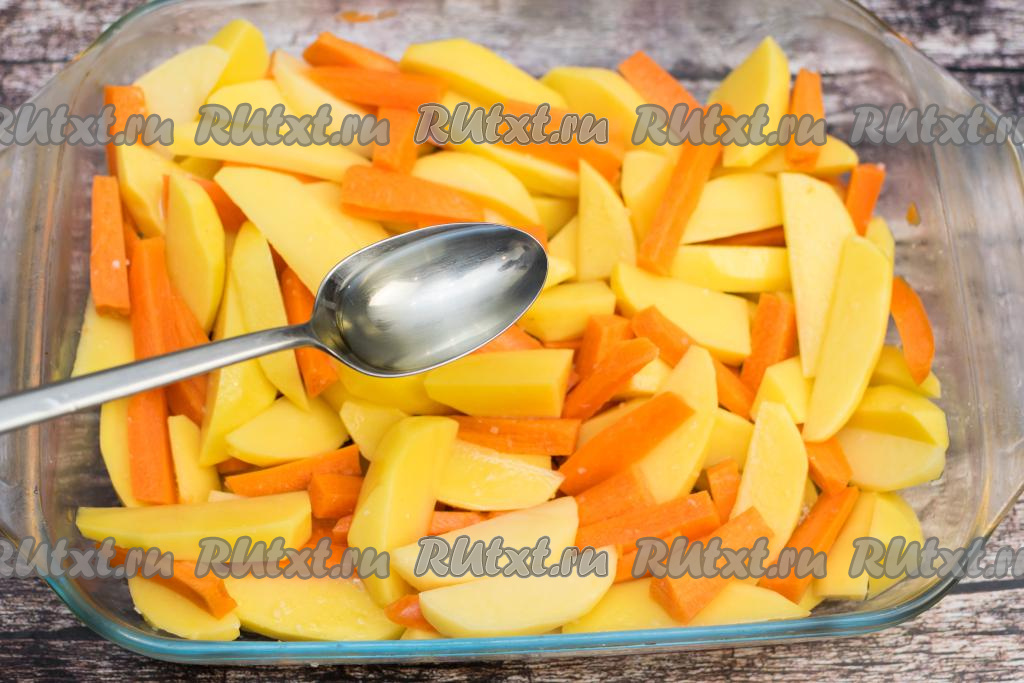 В форму с картошкой и морковкой влить растительное масло, посолить овощи по вкусу. Хорошо перемешать, покрывая овощи солью и маслом со всех сторон.