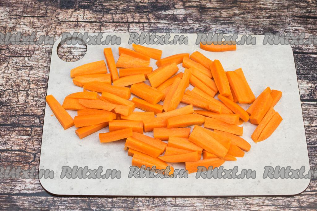 Морковку очистить, промыть водой, нарезать на средние брусочки.