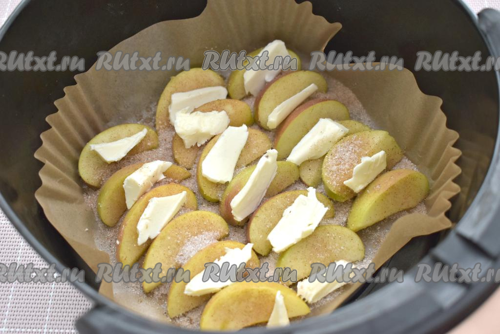 Поверх яблочных долек раскладываем сливочное масло, нарезанное на маленькие кусочки. Отправляем чашу с яблоками в аэрогриль.