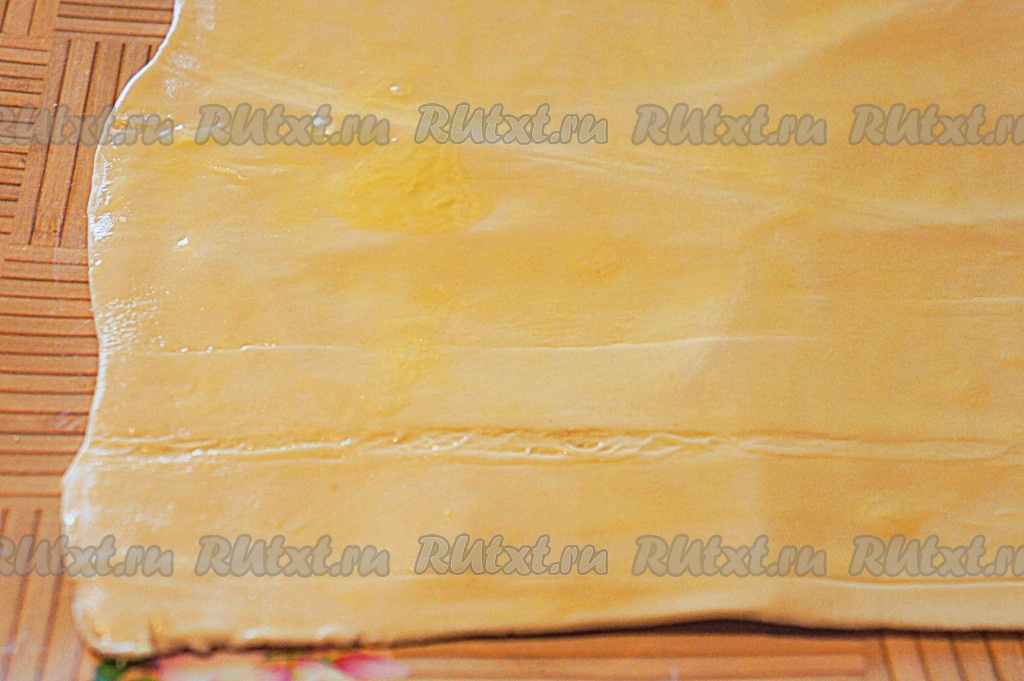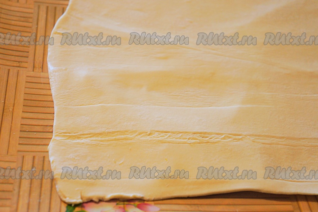 Тесто раскатать толщиной 0,5 мм, при необходимости добавьте немного муки при раскатывании.
