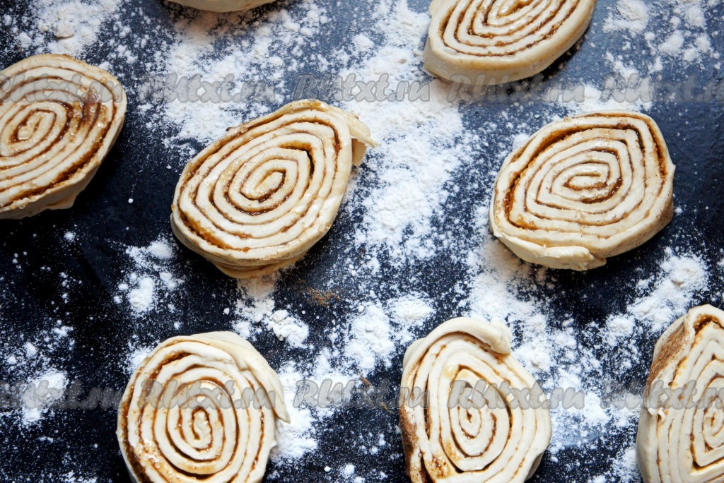 Нарезать рулет на небольшие кусочки по 2-3 см толщиной. Противень присыпать мукой (или воспользоваться силиконовым ковриком), выложить будущие булочки. При этом учтите, что тесто в 2 раза увеличится при выпекании.