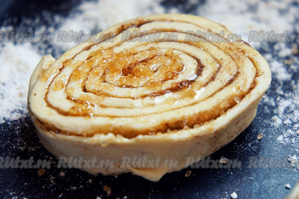 Каждую булочку с корицей смазать хорошо взбитым яйцом и ещё немного посыпать коричневым сахаром.