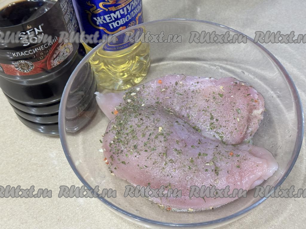 Я в качестве специй использовала пряную соль с чесноком. Филе будет в дальнейшем мариноваться в соевом соусе, а он достаточно солёный, поэтому, если будете использовать набор специй, в составе которых есть соль, добавляйте их немного (не более крупной щепотки). Если же будете использовать классические специи, в составе которых нет соли, тогда можно соль вовсе не добавлять или добавить её совсем немного, обязательно учитывая степень солёности соевого соуса, с которым вы готовите.