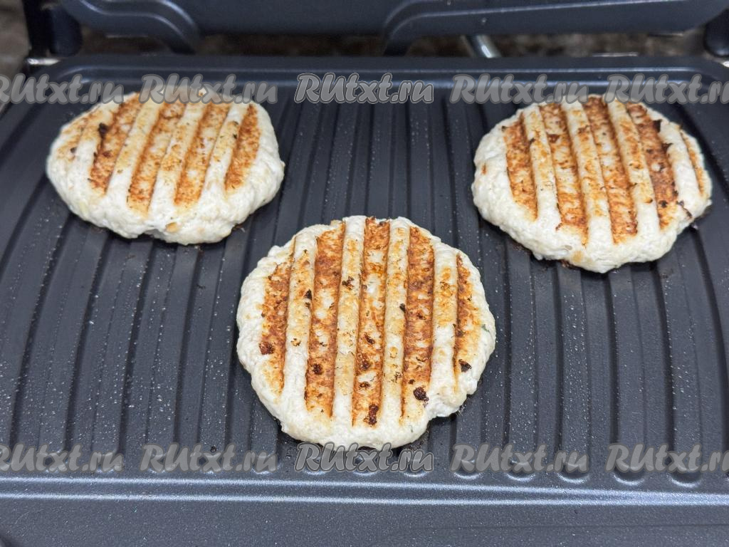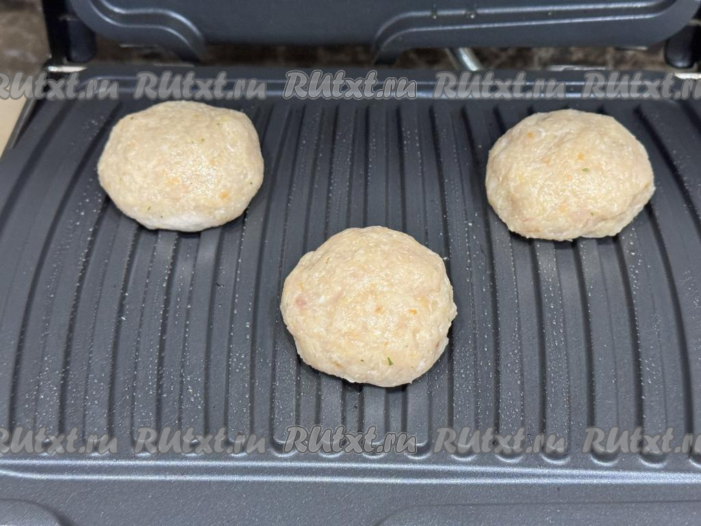 Закрыть створки электрогриля и готовить куриные котлеты примерно 7 минут.