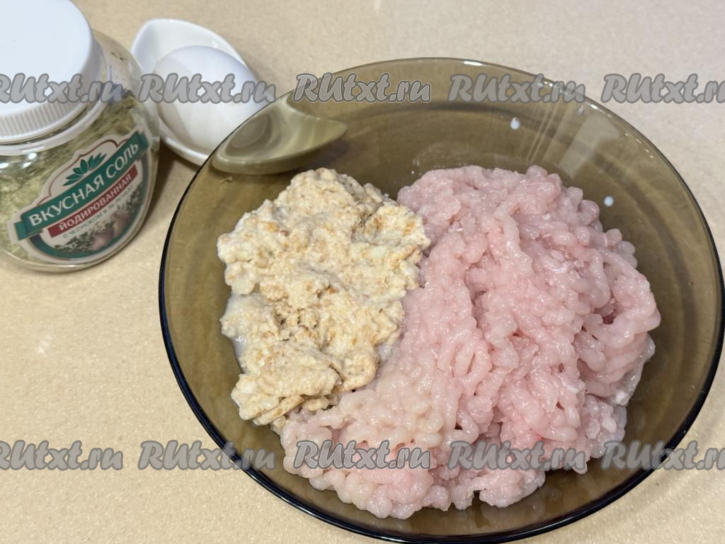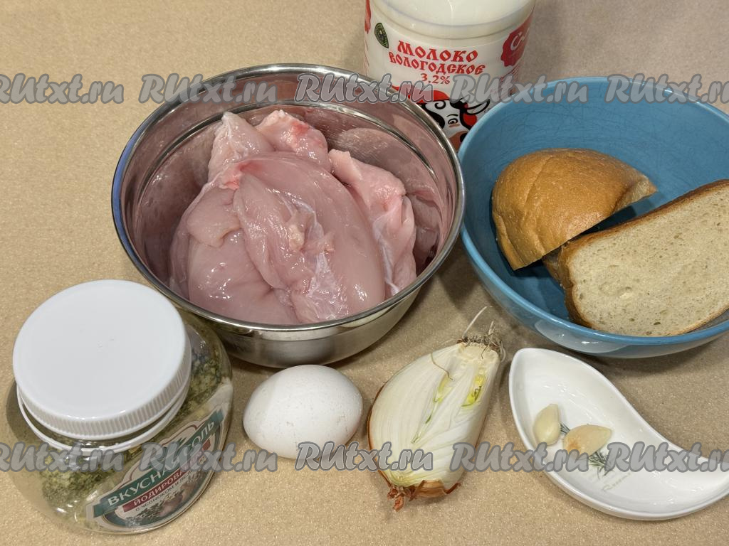 Кусочки батона (или белого хлеба) выложить в небольшую ёмкость, залить полностью молоком и оставить минут на 5. Лук и чеснок очистить. Пропустить через мясорубку куриное филе, лук, чеснок и хлеб, предварительно отжав его от лишнего молока.