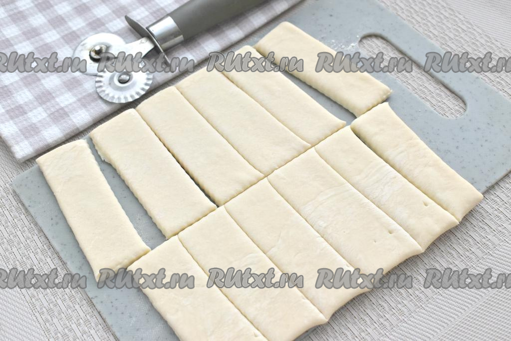 Поверхность стола (или разделочной доски) посыпаем немного мукой, выкладываем размороженный пласт слоёного теста. Не раскатывая тесто, с помощью пиццерезки (или острого ножа) нарезаем его на прямоугольные полоски размером примерно 3 сантиметра на 7,5 сантиметров. В результате у меня получились 12 полосок.