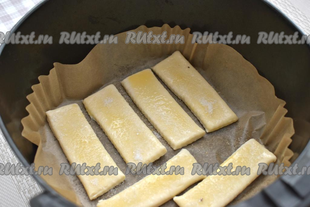 Чашу аэрогриля застилаем пергаментом, выкладываем полоски из слоёного теста в один слой. У меня поместились только 6 полосок, поэтому я выпекала язычки в два захода. Полоски из теста смазываем взбитым яйцом.